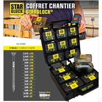 Le coffret de chantier vis bois agglo/vis VBA Starblock® contient 1350 vis en acier zingué blanc à tête fraisée et empreinte Torx®. Il offre un équipement complet de visserie bois grâce à ses 15 tailles de vis rangées dans 14 étuis ceinture à ouverture facile. Idéal pour la fixation et...