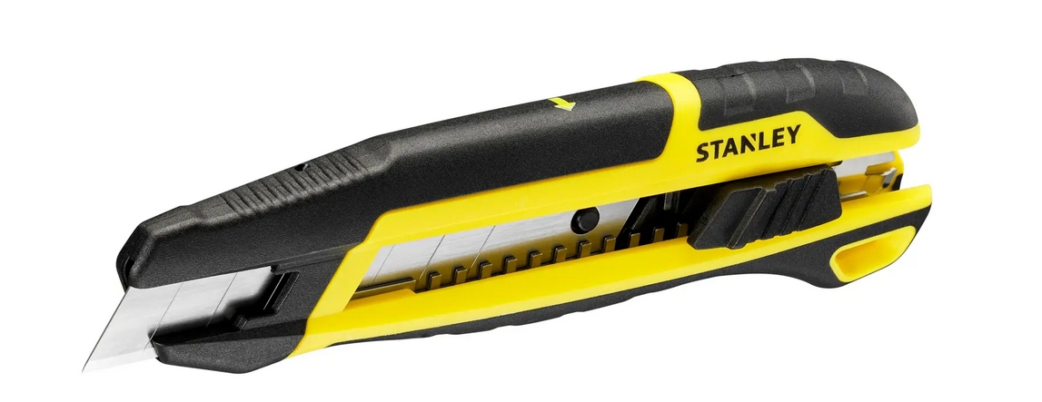Le cutter 18 mm Quick Snap STANLEY® à bouton poussoir intègre un mécanisme unique de casse de la lame. Rapide, facile, sûr, le tout à une seule main, sans recourir à aucun outil ou accessoire. Il suffit de positionner le segment de lame sur le trait de casse, actionner en toute sécurité le mécanisme Quick Snap et continuer à couper avec un nouveau bord tranchant. Ce cutter innovant est idéal pour un large panel d'applications professionnelles, telles que la découpe de plaques de plâtre, d'isolants, de papier peint et autres matériaux. Il dispose d'un guide lame en acier inoxydable résistant et testé pour 2 000 casses. Conçu pour le confort et la praticité, ce cutter comprend un manche bi-matière ergonomique, apportant une bonne adhérence, minimisant ainsi le risque de dérapage. Son design optimisé procure une excellente expérience de coupe. Ce modèle est équipé d'une bouton poussoir pour un ajustement de la sortie de la lame rapide et intuitif. Il est également doté d'une boucle d'attache intégrée pour un rangement pratique et une sécurité accrue lors des travaux en hauteur.