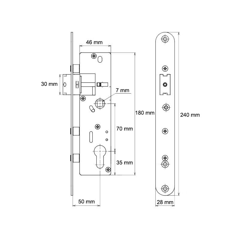 . Serrure à larder de portail. • Coffre en polyamide et inox. • Têtière bouts ronds en inox. • Réglage du pêne 1/2 tour en profondeur. •...