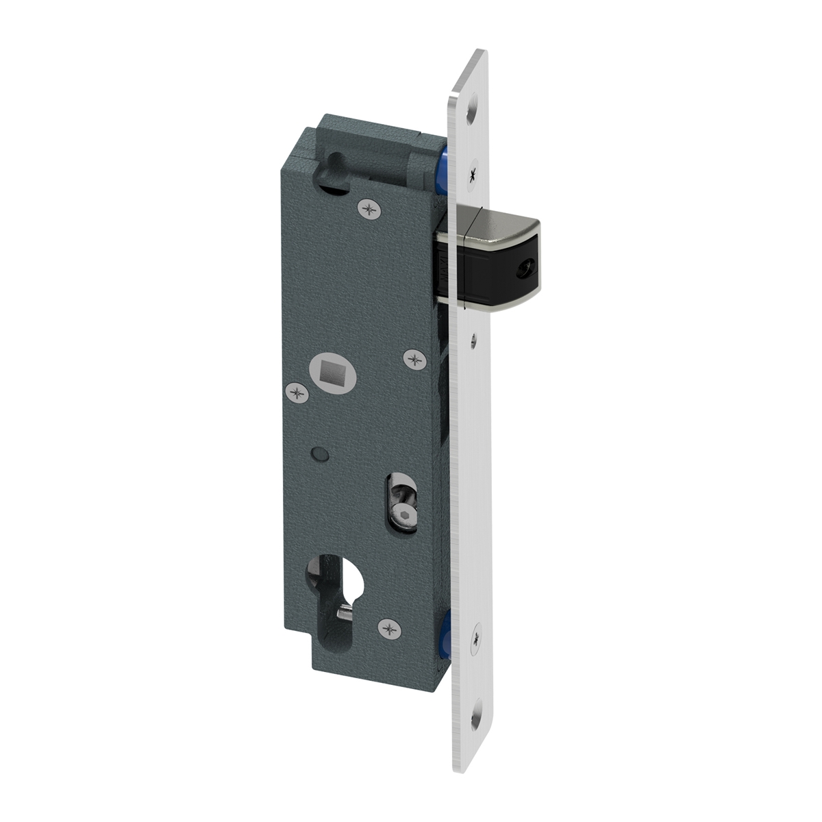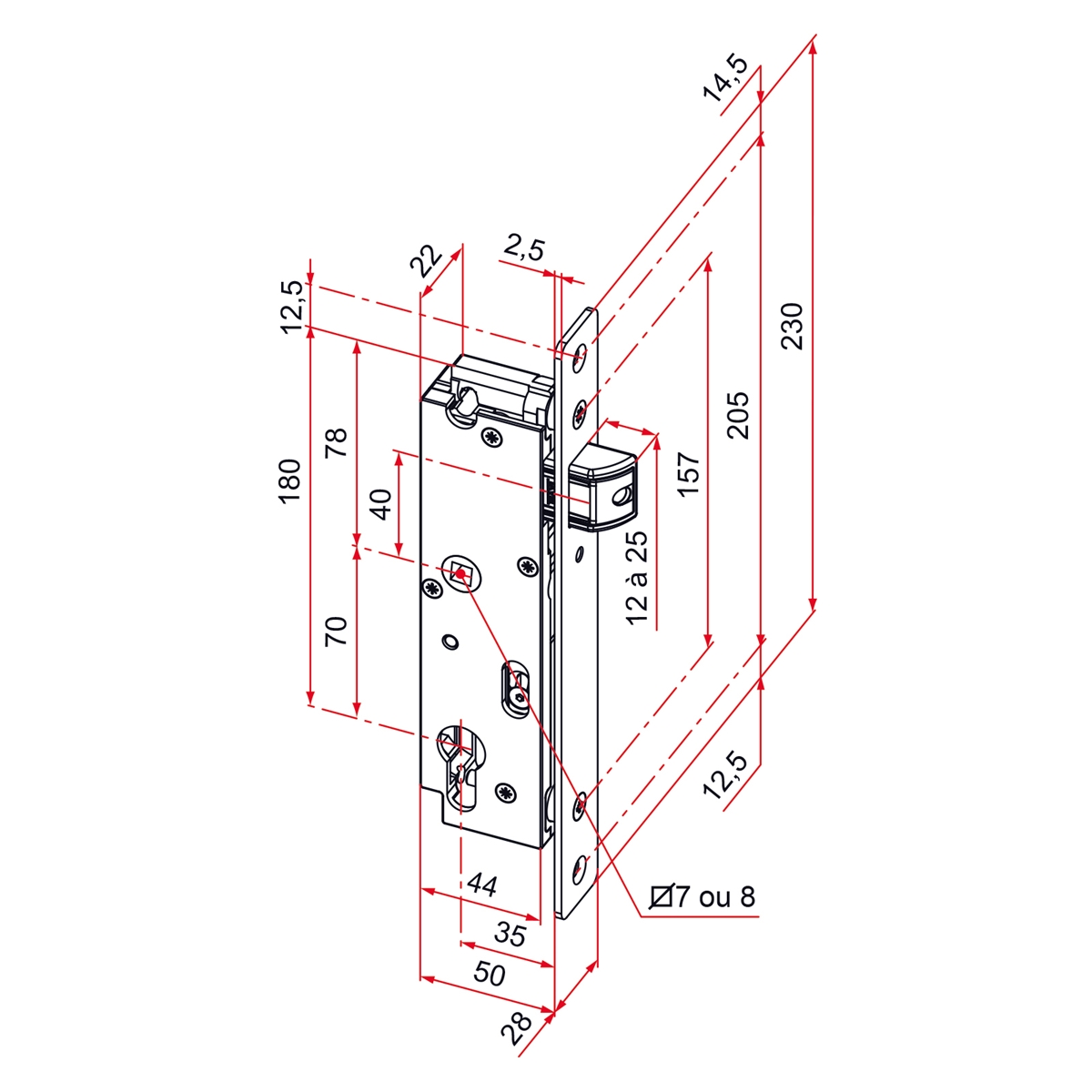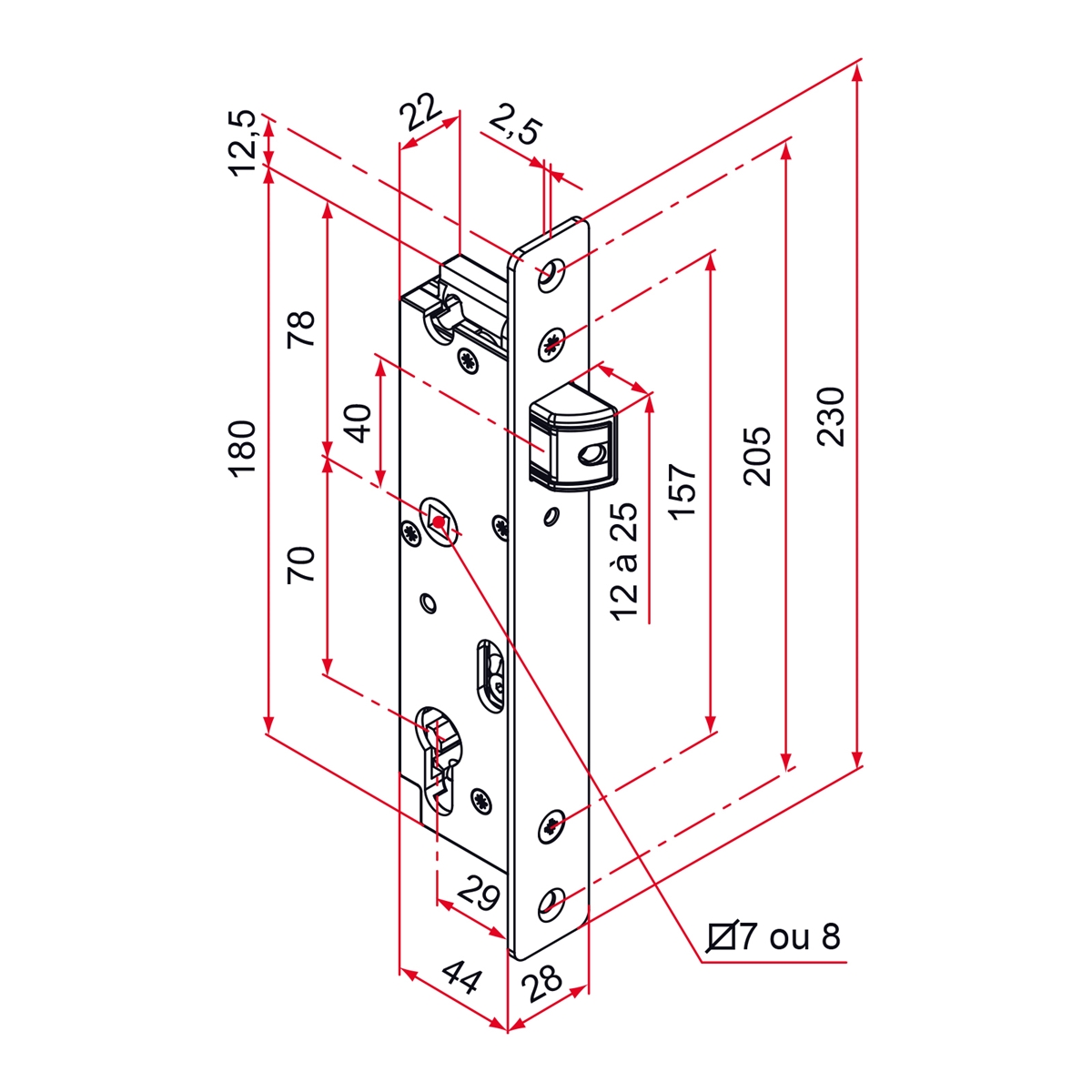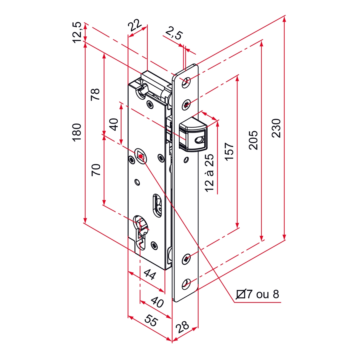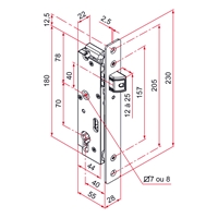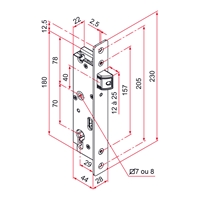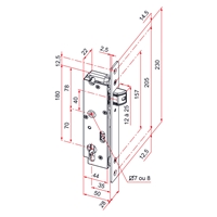 . Serrure à larder de portail. • Coffre en polyamide et inox. • Têtière bouts ronds en inox. • Réglage du pêne 1/2 tour en profondeur. •...